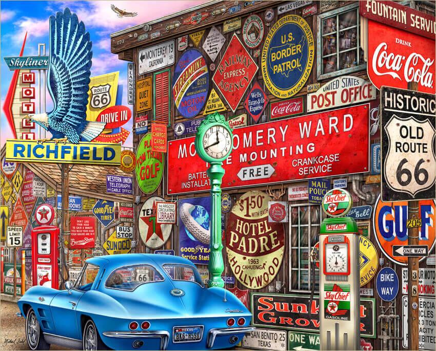 Full size framed posters, metal signs, prints and jigsaw puzzles of my paintings can be found at several different online locations among them in America are, wall posters at Blackball/Scorpio Posters, Studio B Posters, metal garage signs of my art at Reedyville Goods and in Canada high quality framed prints of my art can be purchased at Frameworth Prints. Many different Jigsaw puzzles of my art are available in America at Springbok Puzzles, White Mountain Puzzles, Masterpieces Puzzles, Ceaco Puzzles, Buffalo Games Puzzles, Vermont Christmas Puzzles. Wooden Puzzles can be found of my art at Natilus Wooden Puzzles in California. Overseas wooden puzzles of my art can be found at Wentworth Puzzles in the UK and jigsaw puzzles at Happy Puzzles UK. My puzzles can also be found in Europe in Germany and France at Schmidt Puzzles, and also framed prints of my art in Europe are available to be ordered and shipped online at Poster Lounge.